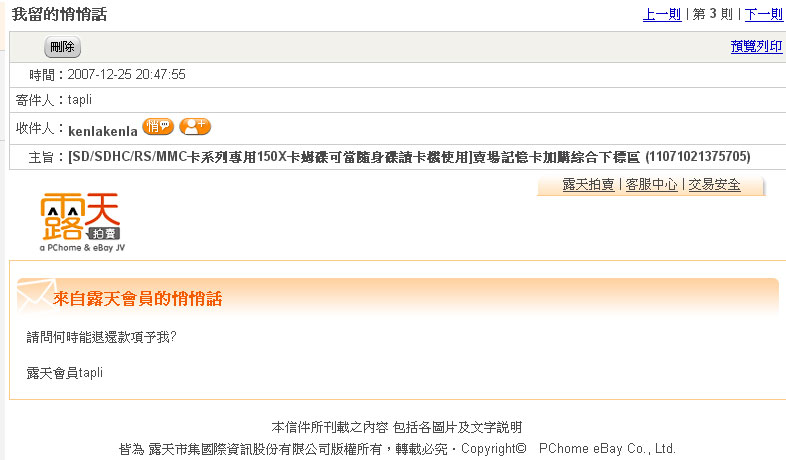 到了2007年12月25日我都還沒收到退款,再次詢問